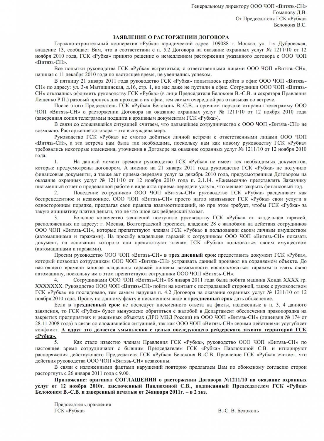 | Уважаемые члены ГСК "Рубка"! В порядке информаци доводим до Вашего сведения о факте злостного и умышленного нарушения прав членов ГСК "Рубка" со стороны бывшего "самоизбранного" председателя Павлюхиной С.В. 12 ноября 2010 г. Павлюхиной С.В. был заключен кабальный договор на оказание охранных услуг с ЧОП "Витязь-СН", карманной охранной структурой её соподвижников, работающих на микояновском заводе, и с которого этот ЧОП "Витязь-СН" благополучно погнали.